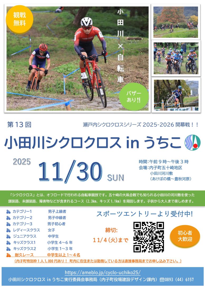 今年も、内子町五十崎地区の豊秋河原で「小田川シクロクロスinうちこ」が開催されます。