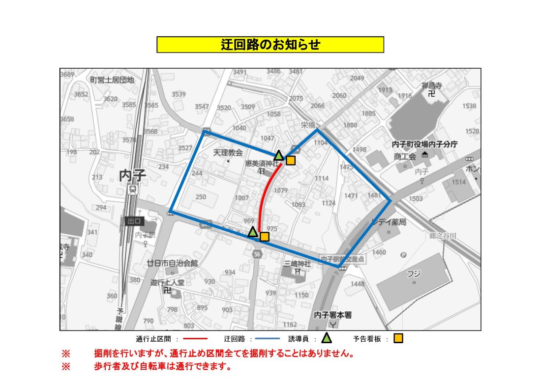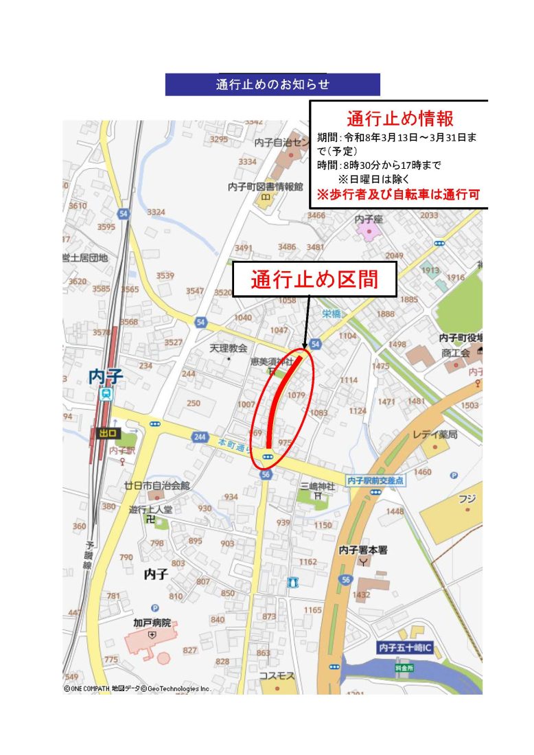 2026.01.09 NEWS 本町通り一部車両通行止めのお知らせ 本町商店街の無電柱化に伴う工事のため、一部車両通行止めが発生いたします。 ご迷惑をおかけいたしますが、ご理解と迂回路通行のご協力をお願い致します。 期間:2026年1月13日(火)~3月31日(火)の間(予定)※日曜日は除く 区間:内子町本町通りの一部【地図参照】 ※歩行者・自転車は通行可能です。