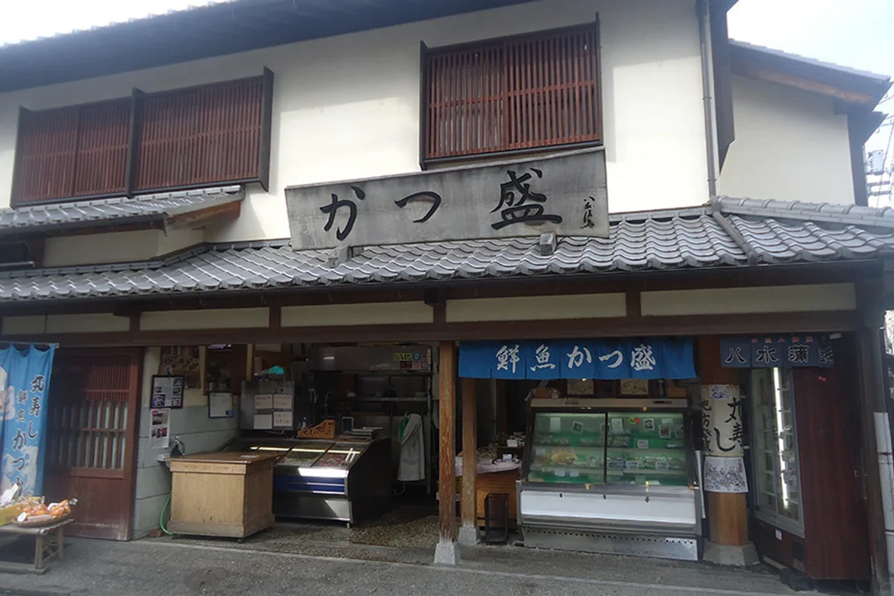 創業約130年の老舗鮮魚店、商店街のほぼ中心町並みの入口にあります。郷土料理の丸寿しはおからを甘酸っぱく調味し、旬の魚で包み込んだもので懐かしい味であり、初めての方には新しい味を感じることのできる料理です。